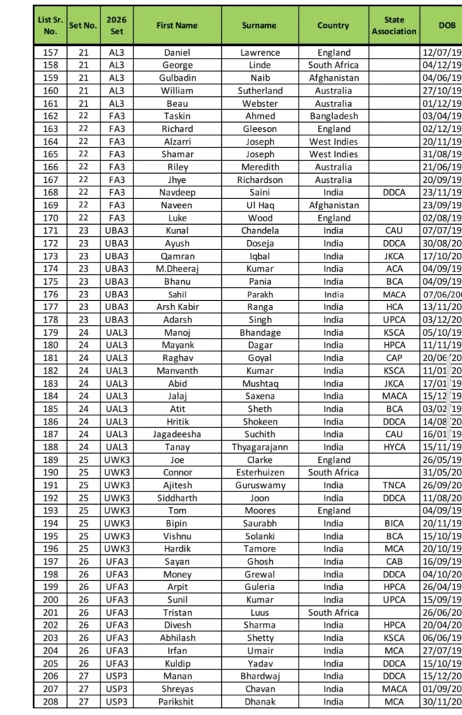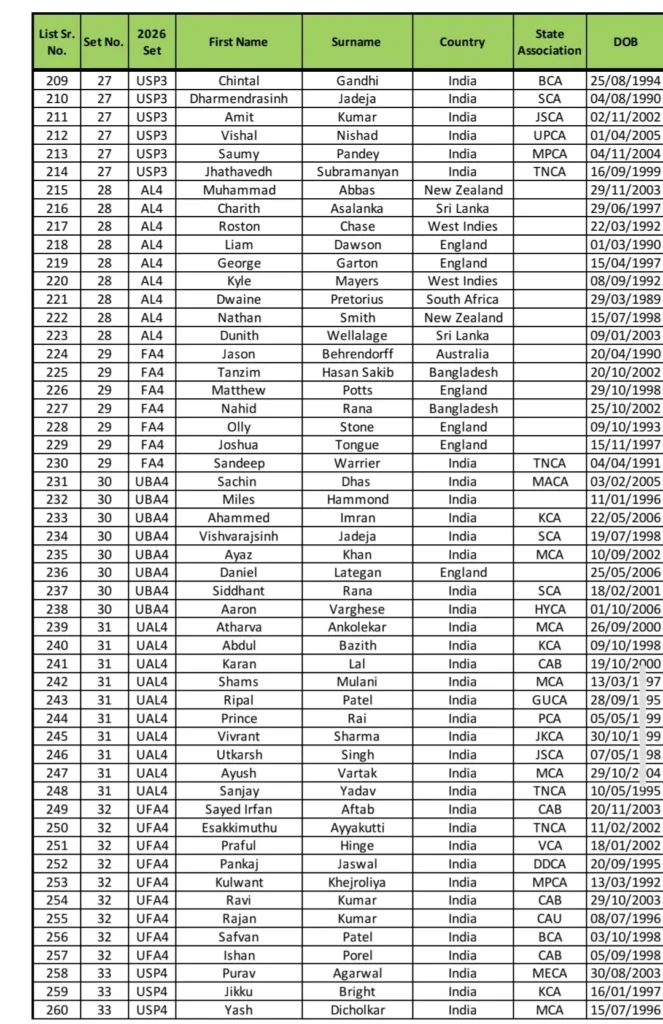 IPL 2026 Set-Wise Players Table